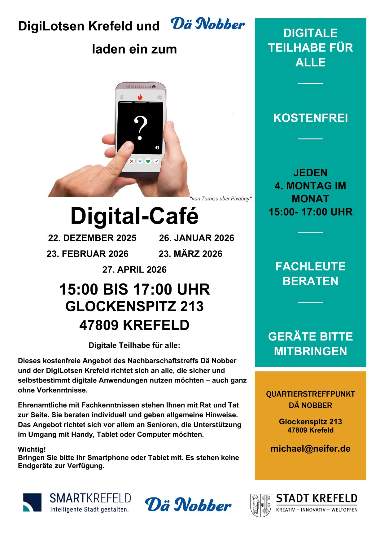 Dieses kostenfreie Angebot des Nachbarschaftstreffs Dä Nobber und der DigiLotsen Krefeld richtet sich an alle, die sicher und selbstbestimmt digitale Anwendungen nutzen möchten – auch ganz ohne Vorkenntnisse.